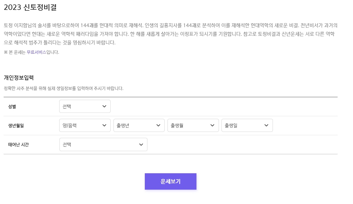 다음과 같은 페이지가 나옵니다. 화면에는 2022 신토정비결, 2022부자되기라고 쓰여있지만 클릭하면 2023으로 제대로 표기됩니다.