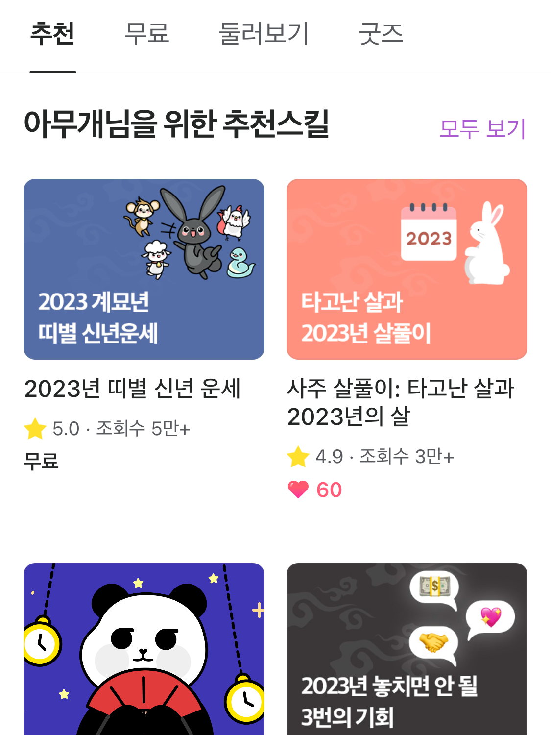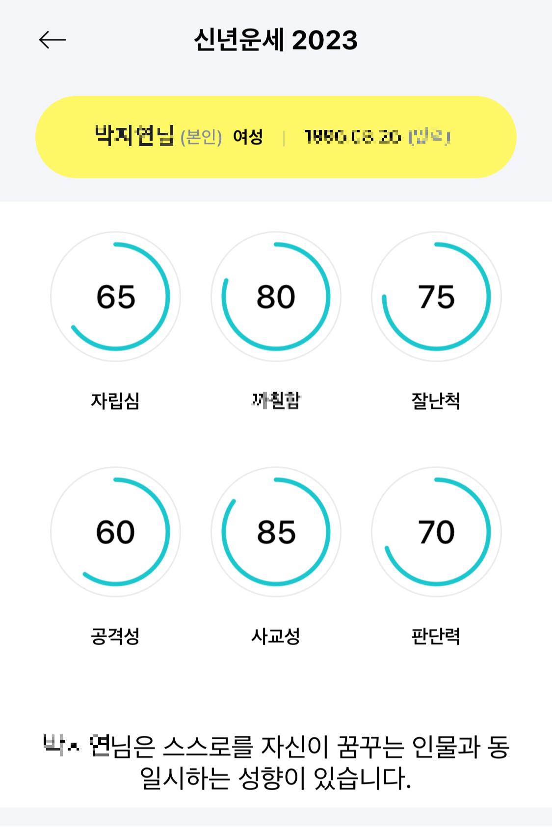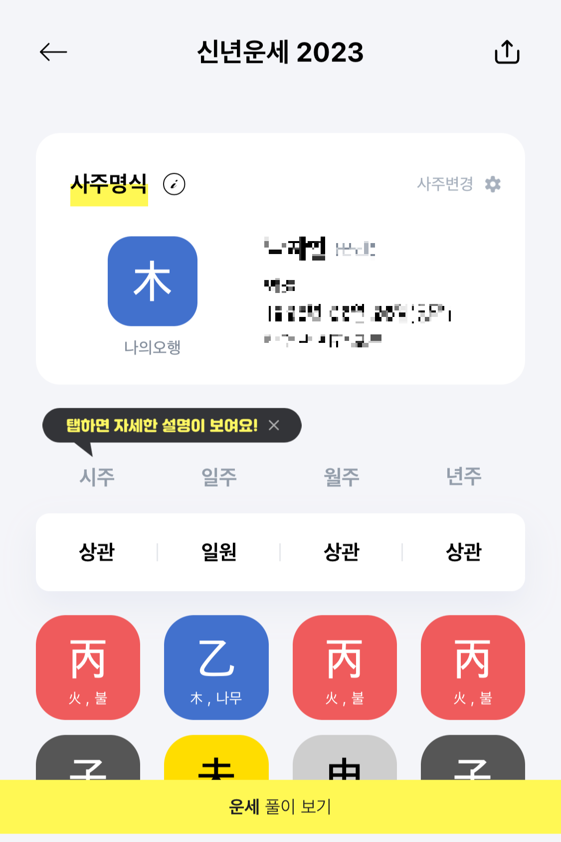 빨간 부분의 애정운, 금전운, 직장운, 그리고 학업/성적운을 클릭하면 더 상세한 설명을 보실 수 있습니다.