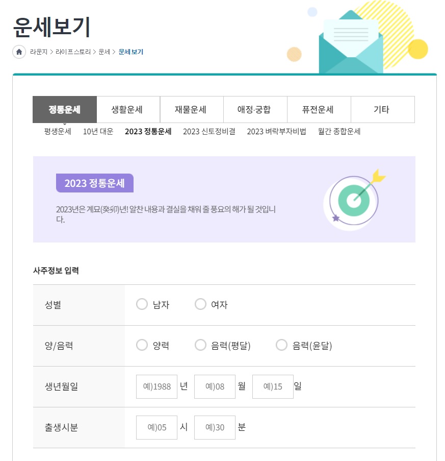 정통운세에 본인의 사주정보를 입력하면 꽤 많은 양의 운세를 볼 수 있습니다.