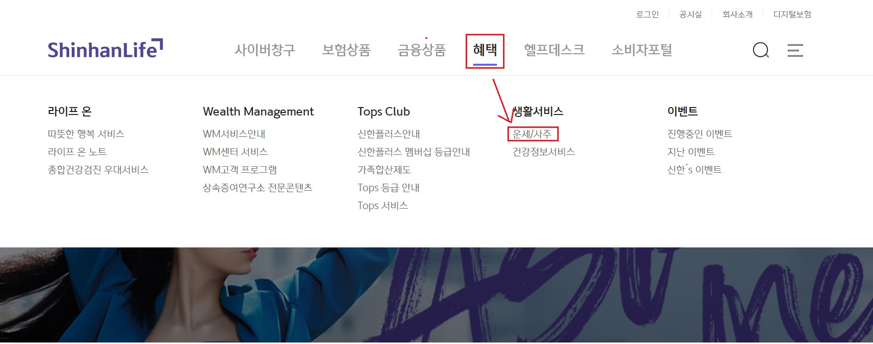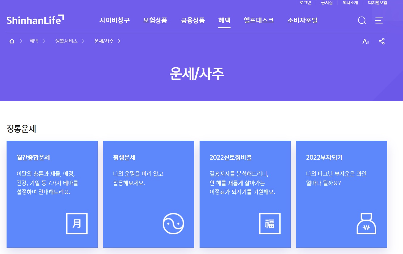 혜택 탭의 생활서비스, 그리고 운세/사주를 클릭하면