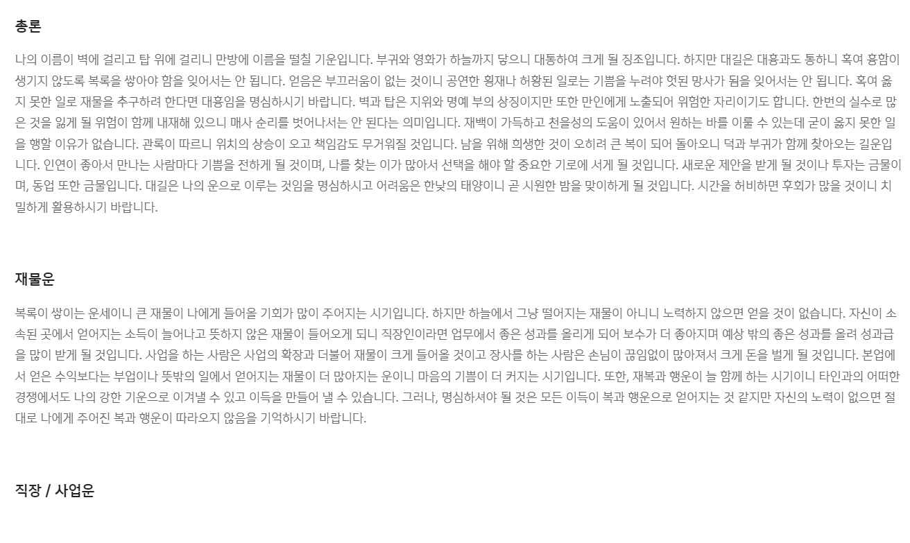 역시 자신의 사주정보를 입력하면 신년운세가 나오는데 읽을거리가 정말 많아서 재밌었습니다.