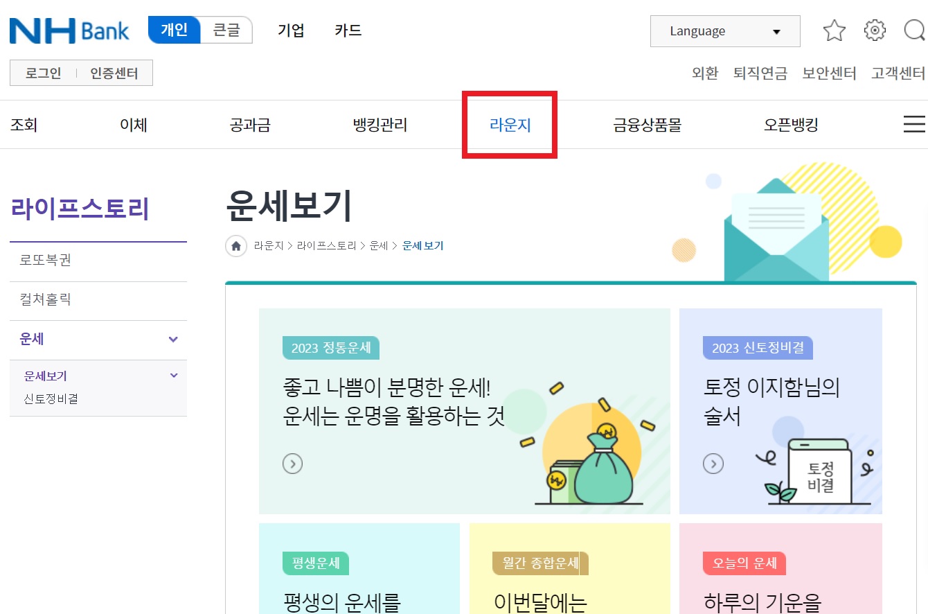 농협 페이지에서 라운지에 들어가면 운세를 볼 수 있습니다.