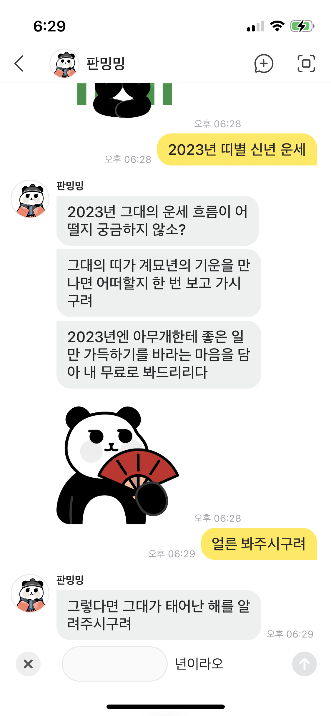 띠별 운세를 클릭하면 판밍밍이라는 캐릭터와 채팅을 합니다.